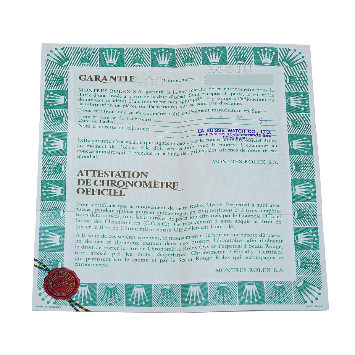 - Warranty (purchased overseas in September 1990) Tag